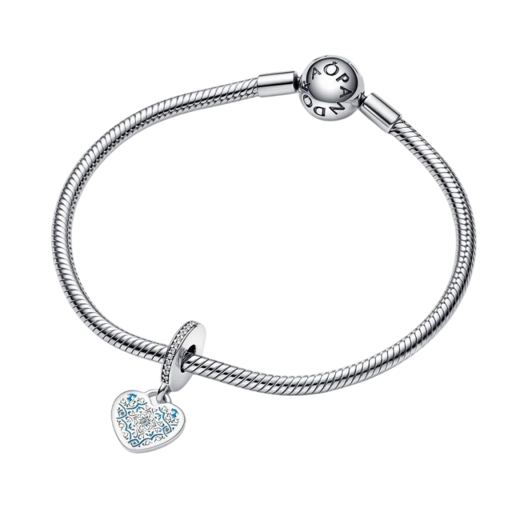 Keep the beauty of Portugal close with our Traditional Portuguese Tile Engravable Dangle Charm. Crafted from sterling silver, this heart-shaped disc features blue enamel detailing, reminiscent of the country's iconic ceramic tiles. The other side is polished, while the bail sparkles with a row of pavé-set round brilliant-cut cubic zirconia. Make it truly yours by engraving a special message on the other side. Add a touch of history and colour to your charm collection with this unique and meaningful charm or gift it to someone special.