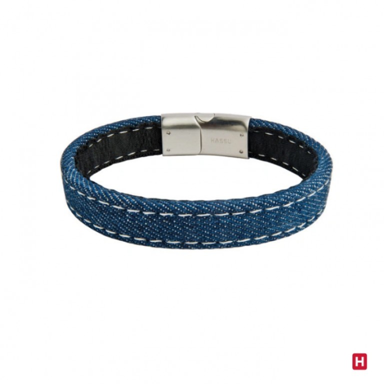 Pulseira em aço e cabedal.