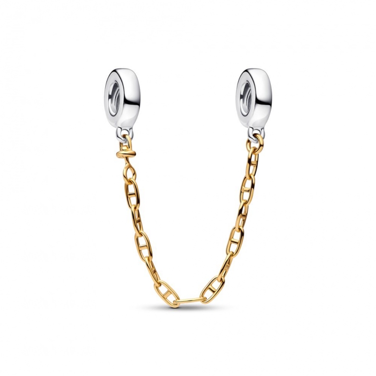 Corrente de Segurança alongada em prata e revestimento de ouro 14k, com um motivo de corrente de âncora e corrente de elos alongada com extremidades roscadas, perfeita para manter as suas contas seguras.
