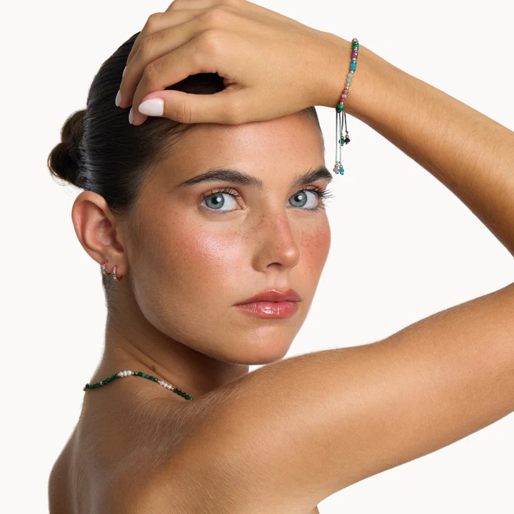 Pulseira de prata com Apatita, Quartzo morango verde, Turmalina rosa, Malaquite e Rubi.