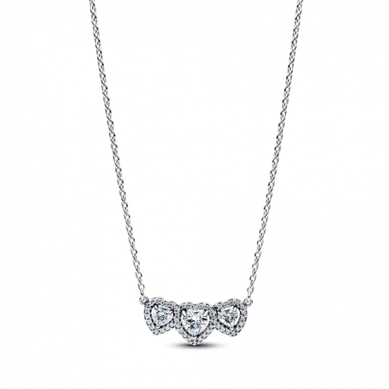Brilhe com amor. O nosso colar de prata apresenta três zircónias em forma de coração, enquadradas numa auréola radiante e unidas em perfeita harmonia. Com um pendente fixo e uma pedra pendente delicada perto do fecho.