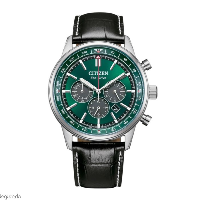 Relógio Citizen CA4720-01X, funcionamento eco-drive com reserva de carga de 9 meses. Cronógrafo 60 minutos em 1/5 de segundo. Calendário.