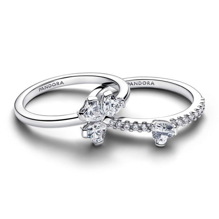 Duplique a sorte. O nosso conjunto de prata de lei 925, inclui dois anéis separáveis - um com três pedras em forma de coração, o outro com uma pedra em forma de coração e um aro pavé. Perfeito para misturar e sobrepor ao seu estilo.