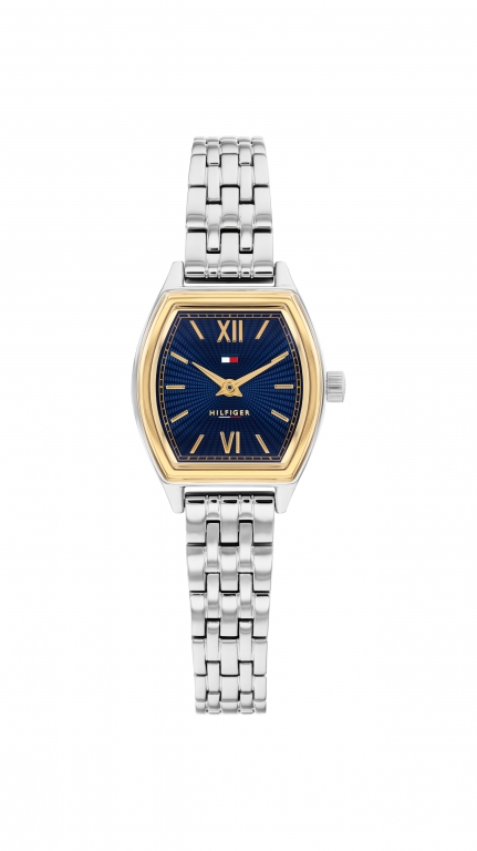Relógio Tommy Hilfiger 1782869, funcionamento a pilha, fundo azul, bracelete aço prateado, caixa bicolor, caixa de 22 mm.