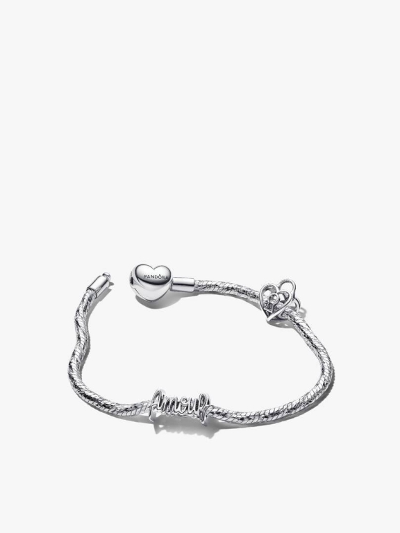 A paixão e o compromisso ganham vida neste conjunto de prata com duas contas rendilhadas, um design "Amour" escrito à mão e um cadeado em forma de coração, conjugado com a nossa pulseira icónica de malha snake torcida, com fecho em forma de coração.