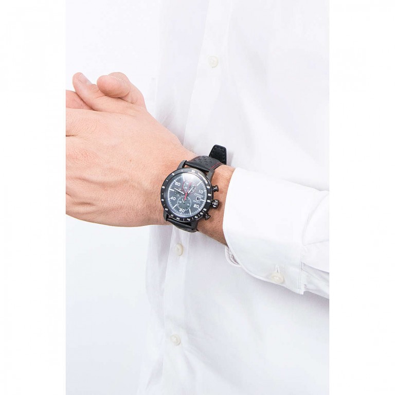 Caixa de aço inoxidável de 44mm. com tampa fechada de enroscar. Coroa oversize. Bracelete de aço inoxidável com fecho duplo de segurança ou correia de pele picoteada de desenho racing. WR 10 atm.