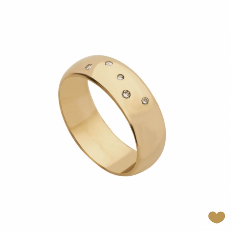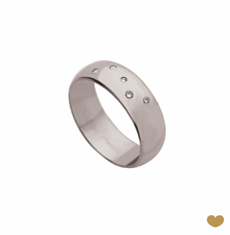 Aliança meia cana em ouro amarelo ou branco de 9 quilates ou de 19 quilates com 6.4 mm de largura, com zircónias.