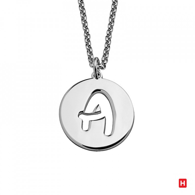 Colar aço medalha círculo com 2 cm de diâmetro, letra recortada, fio com 46 cm de comprimento