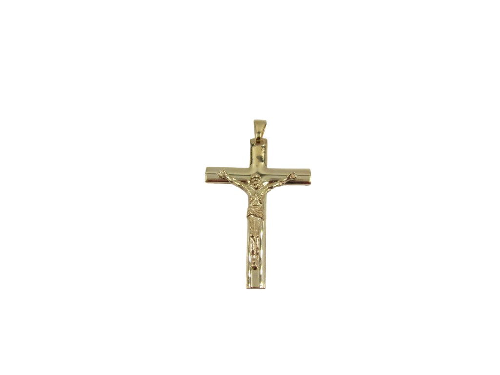 Medalha de prata dourada, crucifixo.