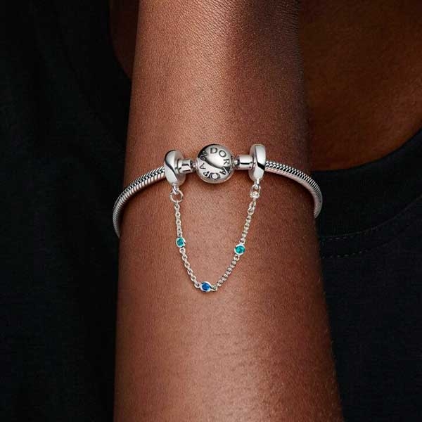 Mantenha os seus tesouros do oceano seguros com esta corrente de segurança inspirada no mar. Em prata 925, cada união tem roscas no interior para fixar as contas na sua pulseira Pandora Moments. Apresenta três cristais azuis man-made na corrente, para dar um toque do oceano ao seu estilo.