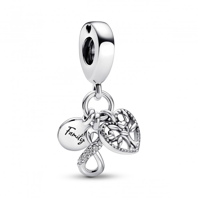 A família está em primeiro, segundo e terceiro lugar nesta conta pendente tripla. Em prata 925, a Conta Pendente Família Infinito apresenta uma árvore da família dentro de um coração rendilhado e um símbolo do infinito decorado com pavé brilhante: três poderosos símbolos de proximidade e amor eterno numa peça de joalharia. Use esta conta pendente para manter perto de si quem mais ama, onde quer que vá.
