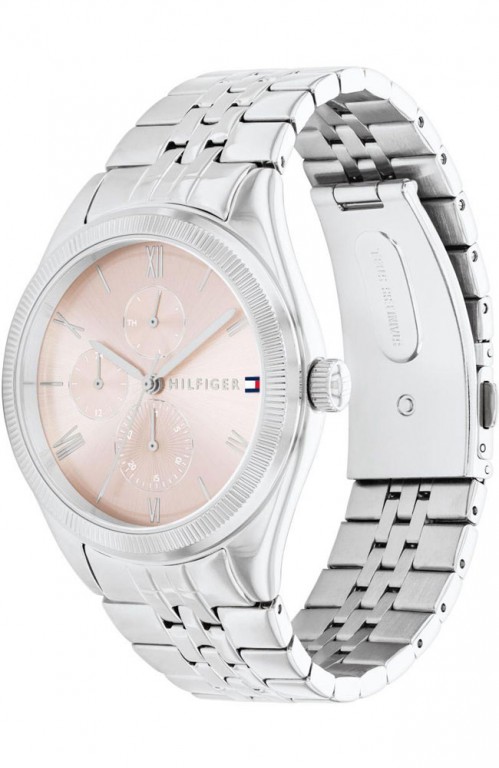 Relógio Tommy Hilfiger 1782590, funcionamento a pilha, bracelete aço prateado, fundo rosa, caixa de 38 mm.