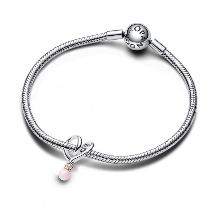 Em prata e revestimento de ouro rosa 14k, a Conta Coração de dois tons é uma peça única para a coleção da sua Mãe. Meticulosamente desenhada para colocar em qualquer suporte de contas, esta conta apresenta um motivo cativante - um coração formado por linhas de prata. Duas gravações, "There is no one like you" e "Mum", acrescentam um toque de amor, com o "u" de Mum (mãe) em forma de coração. Um alfinete pendente com revestimento de ouro rosa 14k apresenta uma opala cor-de-rosa man-made, representando a beleza da maternidade. Abrace a plenitude do amor materno com esta sofisticada conta coração Pandora.