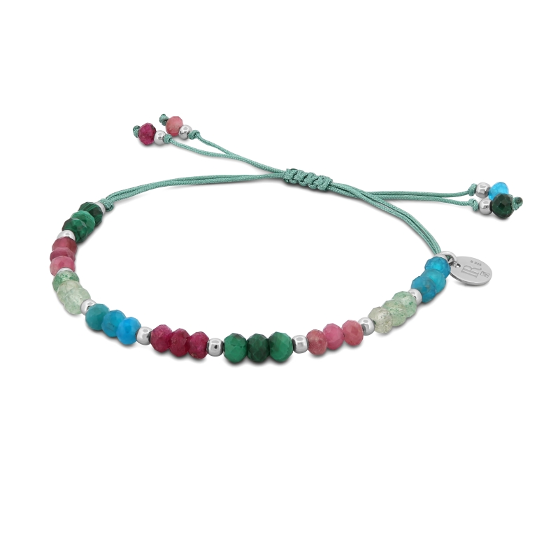 Pulseira de prata com Apatita, Quartzo morango verde, Turmalina rosa, Malaquite e Rubi.