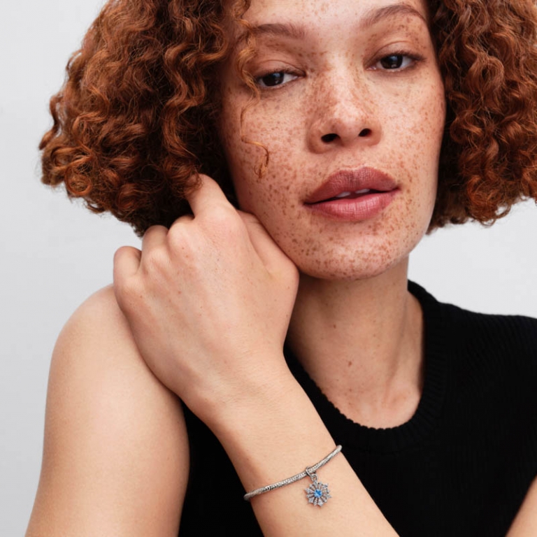Transmita a força e a graça da Rainha Elsa. Em prata, esta conta pendente floco de neve brilha com cristais man-made azul gelo e zircónias transparentes - um tributo brilhante ao poder interior e à transformação.