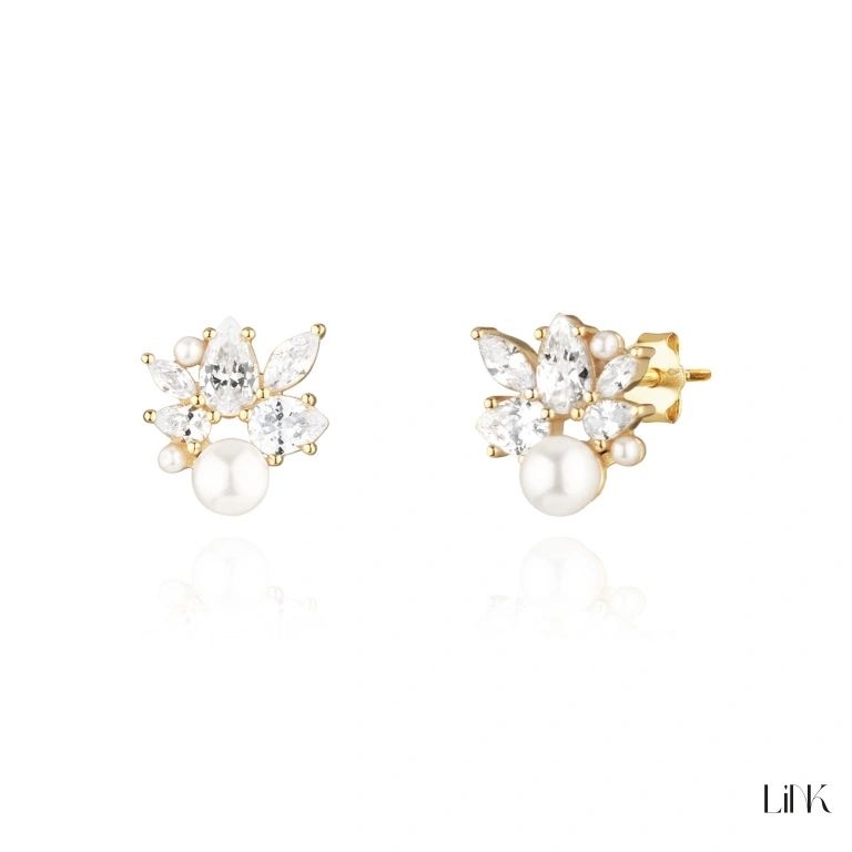 Brincos de prata dourada com zircónias e pérolas.