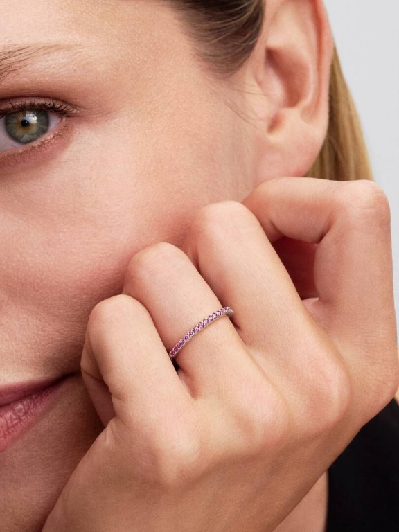 Brilho infindável para o seu amor infinito. Este aro em prata de lei 925 é cravado com zircónias rosa a toda a volta, simbolizando uma ligação interminável e brilho de todos os ângulos.