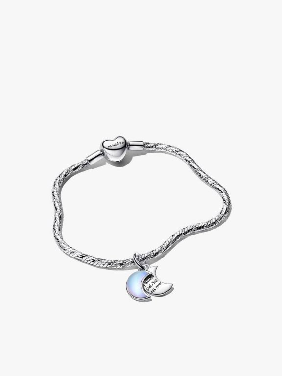 Formule um desejo e alcance a lua. Conjugue a sua pulseira malha snake de prata com uma conta lua crescente. Com a mensagem gravada "I WOULD GIVE YOU THE MOON" e preenchida com vidro iridiscente, é um reflexo do seu brilho e mistério.