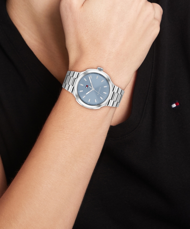 Relógio Tommy Hilfiger 1782818, funcionamento a pilha, fundo azul, bracelete aço, caixa prateada, caixa de 36 mm, com calendário.