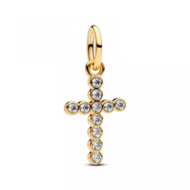 Deixe a sua fé brilhar com este símbolo de amor e esperança. Zircónias transparentes cintilantes formam uma cruz com revestimento de ouro 14k. Perfeita para sobrepor ou usar sozinha como uma peça marcante com significado.