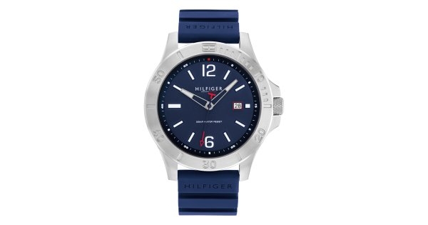 Relógio Tommy Hilfiger 1791991, funcionamento a pilha, bracelete cautchu azul, fundo azul, caixa de 46 mm.