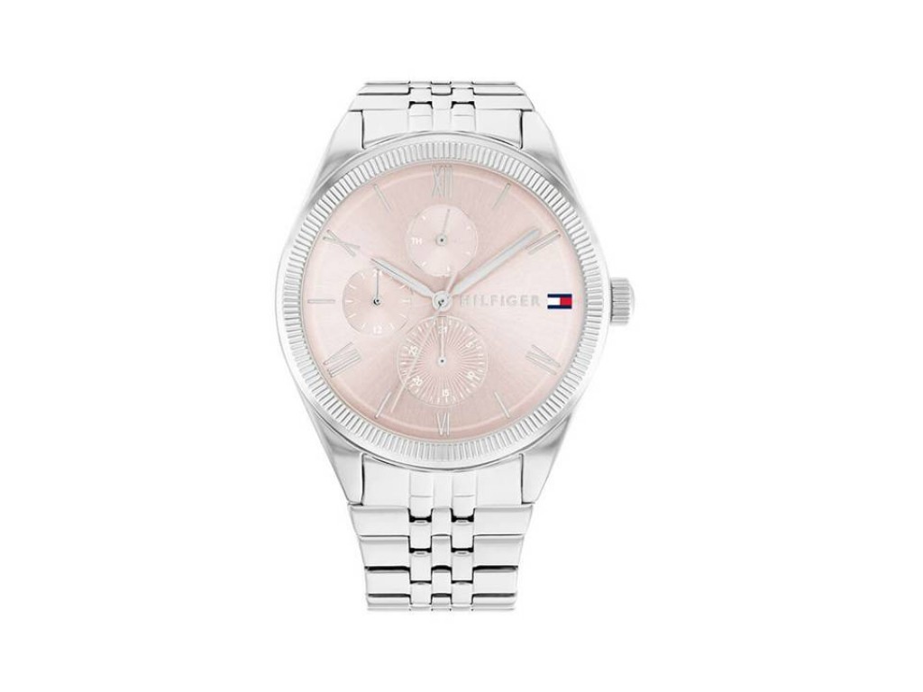 Relógio Tommy Hilfiger 1782590, funcionamento a pilha, bracelete aço prateado, fundo rosa, caixa de 38 mm.